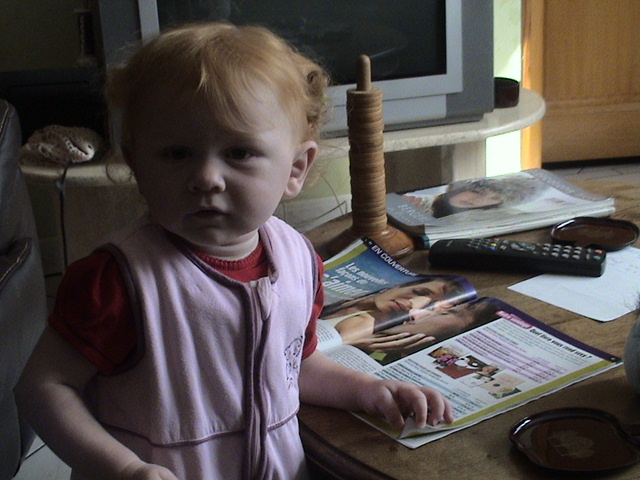 On dit que les jeunes ne lisent plus. En ce qui concerne Lola, c'est faux, elle adore les magazines. Bien sûr, pour l'instant c'est pour tourner les pages ou les déchirer. Ici on la voit avec le dernier "ça m'intéresse" qui titre sur la couverture: "les nouvelles façons de s'aimer." (conneries!!!!!!) Ou alors, elle farfouille dans la bibliothèque, sort toujours le même livre, le roseau pensant de JL Curtis, allez savoir pourquoi. Puis elle se met à tourner les pages, sans précautions, jusqu'à ce que je lui retire des mains, par respect pour son auteur. Heureusement la messe bleue se trouve bien trop haut pour qu'elle puisse l'atteindre. Elle aura de la chance, plus tard, de pouvoir lire sa première année d'existence.
