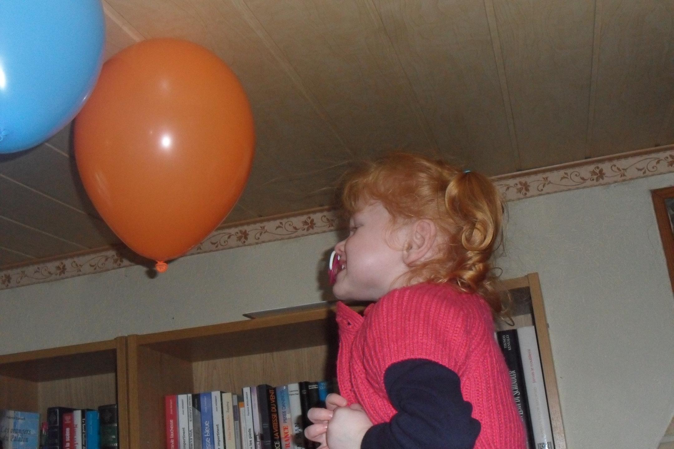 Magiques ces ballons de baudruche, et idéaux pour bien jouer dans la maison. Ils sont légers et on peut les lancer violemment avec les mains et avec les pieds. Ils ne risquent pas de causer des dégâts. C'est l'activité qui occupe Lola et Papy. Le jeu consiste à faire de telle sorte que le ballon ne touche jamais le sol. Et la petiote est experte en la matière. Mais, oh surprise, à un certain moment, ces baudruches sont restées collées au plafond, sans superglue pour les maintenir. Par quel miracle? Je pose la question à tous mes copinautes et visiteurs. Comment se fait-il que des ballons de baudruche puissent se maintenir au plafond, pendant quelques minutes, sans colle évidemment? La solution au prochain  numéro.